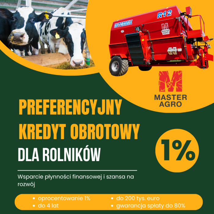 Od października 2025 dostępna jest specjalna oferta kredytów obrotowych dla rolników z oprocentowaniem wynoszącym maksymalnie 1%. Kredyt można przeznaczyć m.in. na zakup poziomego paszowozu INTERMIX.